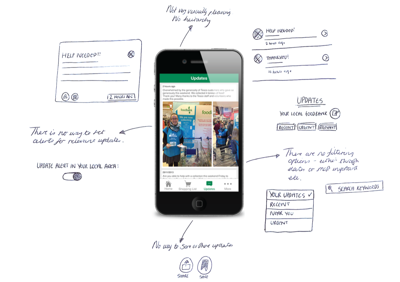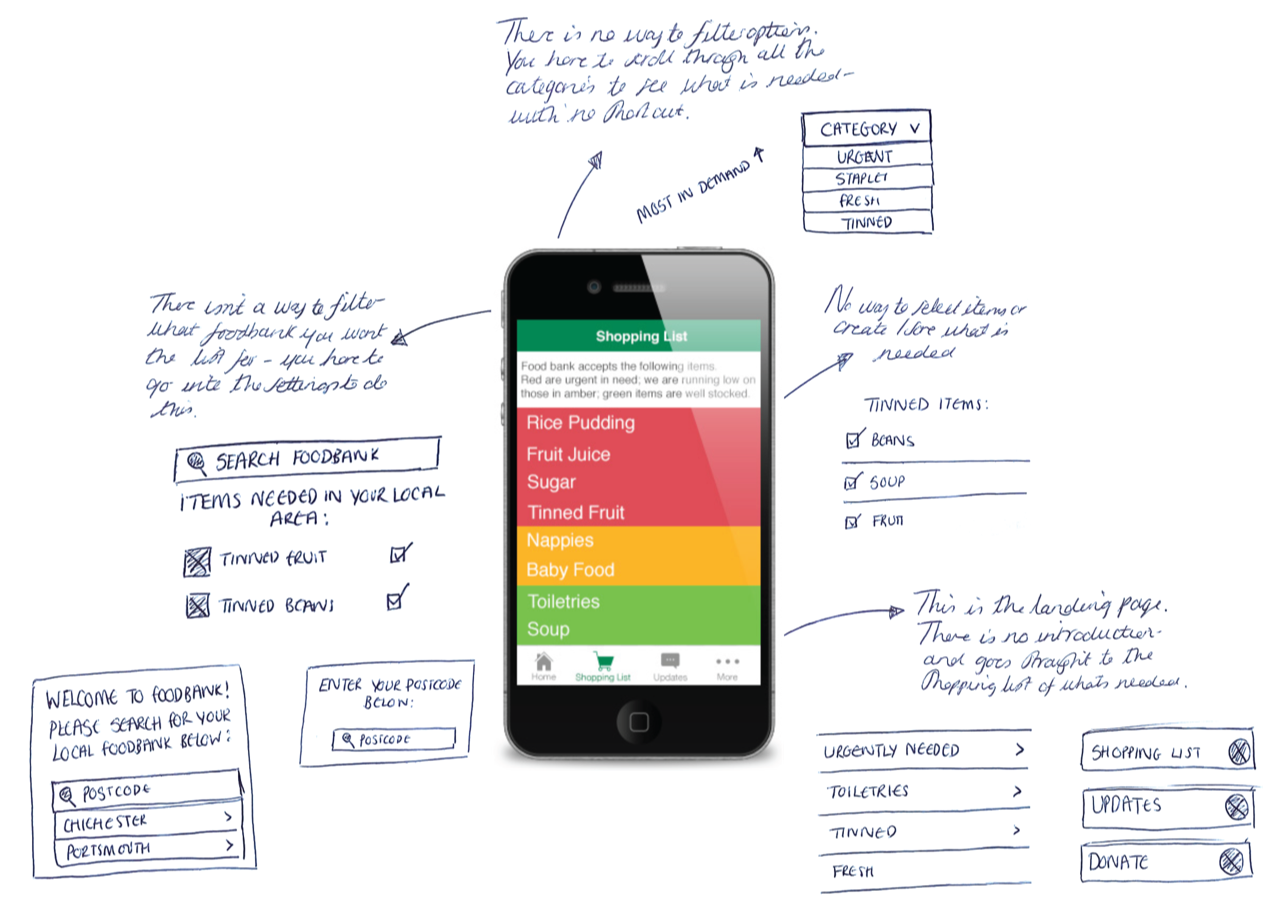 I focused on ideas that simplify navigation and improve usability. Potential solutions included a clear landing page which introduces the user, filtering options for foodbanks and products to make searches faster, reworking the UI for consistency across screens, and refining visual hierarchies to guide users intuitively through key actions. These concepts aimed to create a cleaner, more accessible interface that supports users in finding help quickly and efficiently